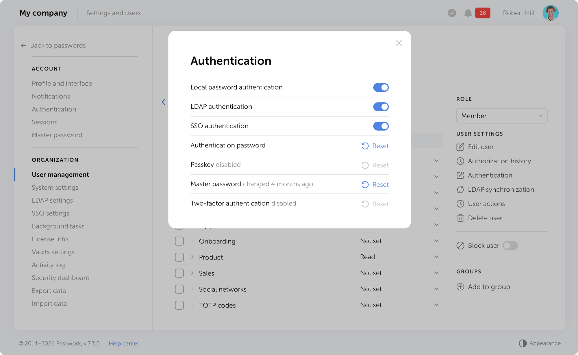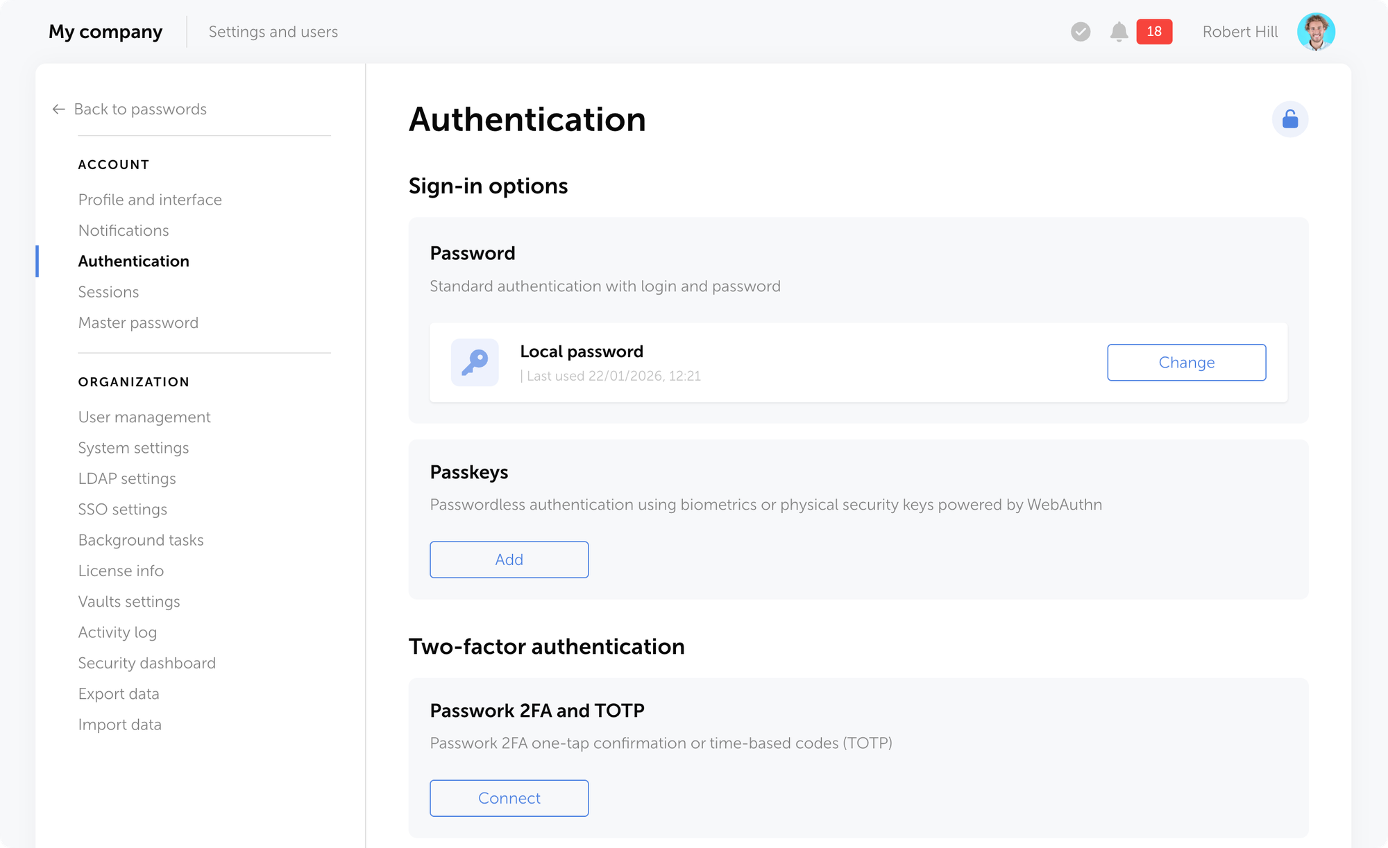 - Multi-factor authentication (MFA): Adds a second verification step beyond your master password. Options include authenticator apps (TOTP), SMS codes, hardware keys (YubiKey), or biometric verification.