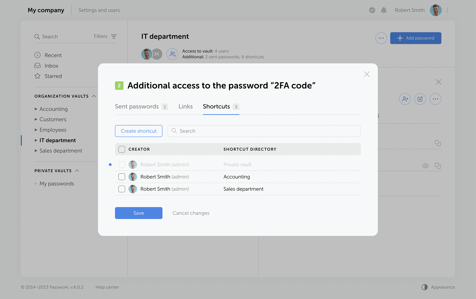 Shortcuts are a new way to share passwords, enhancing collaboration flexibility. There's no need for creating password duplicates in different vaults — instead, create multiple shortcuts in required directories. All changes to original passwords are reflected in shortcuts, keeping your team up to date. Users can view or edit data via shortcuts according to their access rights.