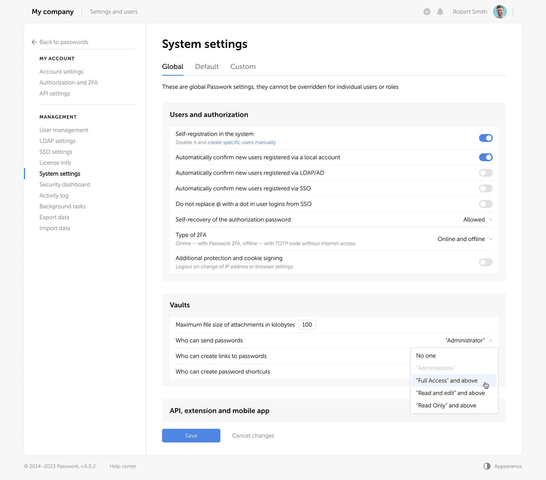 Previously, these settings were applied individually to each user. Now, they are applied to everyone with a certain level of vault access. For example, anyone with the “Edit” access rights or higher can create hyperlinks to passwords. These parameters are located in the system settings under the “Global” tab.