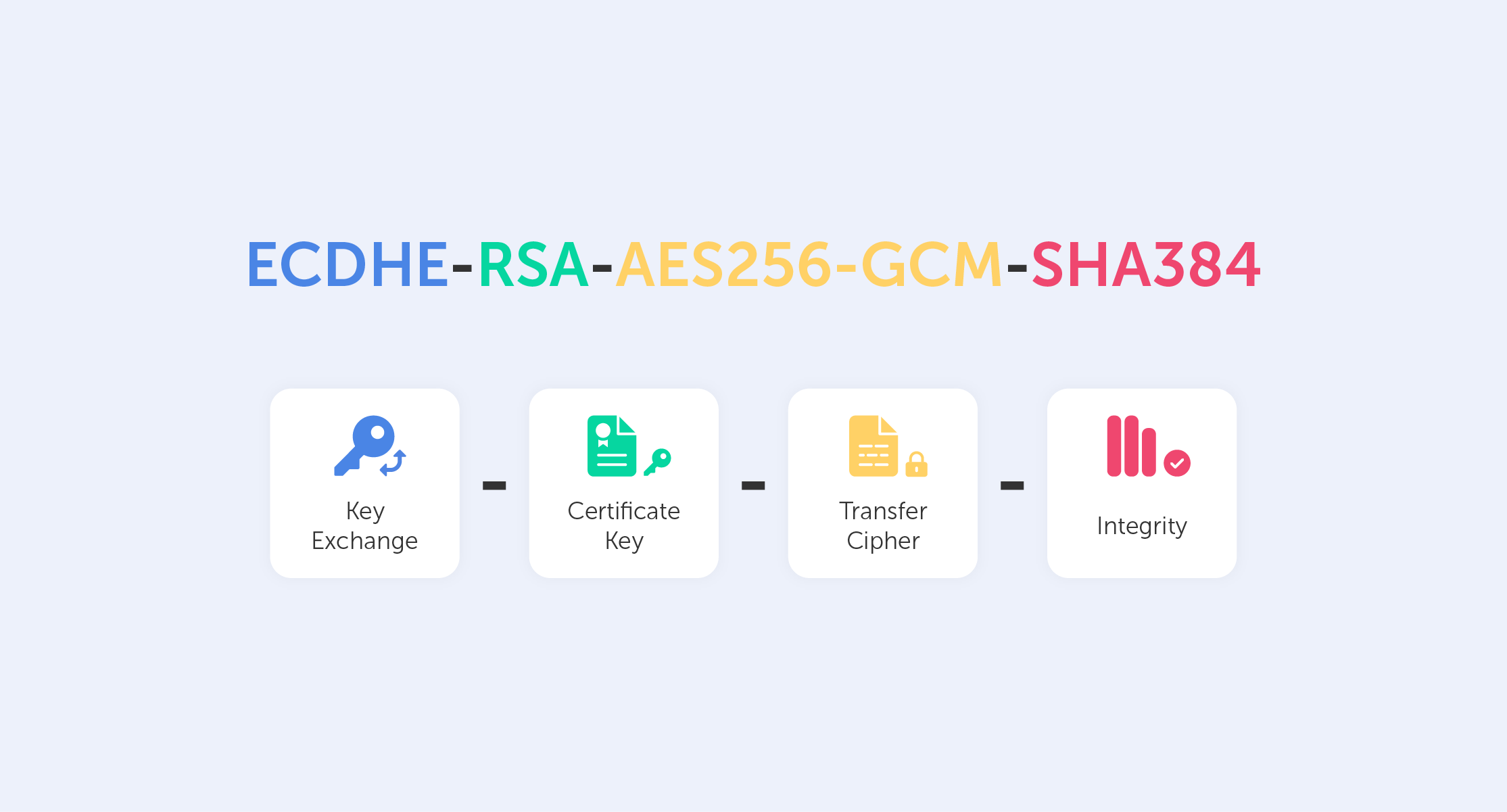 Hashing algorithm. For example, the entry "SSL_DHE_RSA_WITH_DES_CBC_SHA" means that the fragment "DHE_RSA" (temporary Diffie-Hellman with RSA digital signature) is defined as a key exchange algorithm; the fragment "DES_CBC" is defined as an encryption algorithm; and the fragment "SHA" is defined as a hashing algorithm. As will be discussed later in TLSv1.3, the key exchange and encryption protocols are combined into an authenticated encryption algorithm with attached data (AEAD), so the entry there will be shorter. Example: TLS_AES_256_GCM_SHA384. The server response includes the following fields: