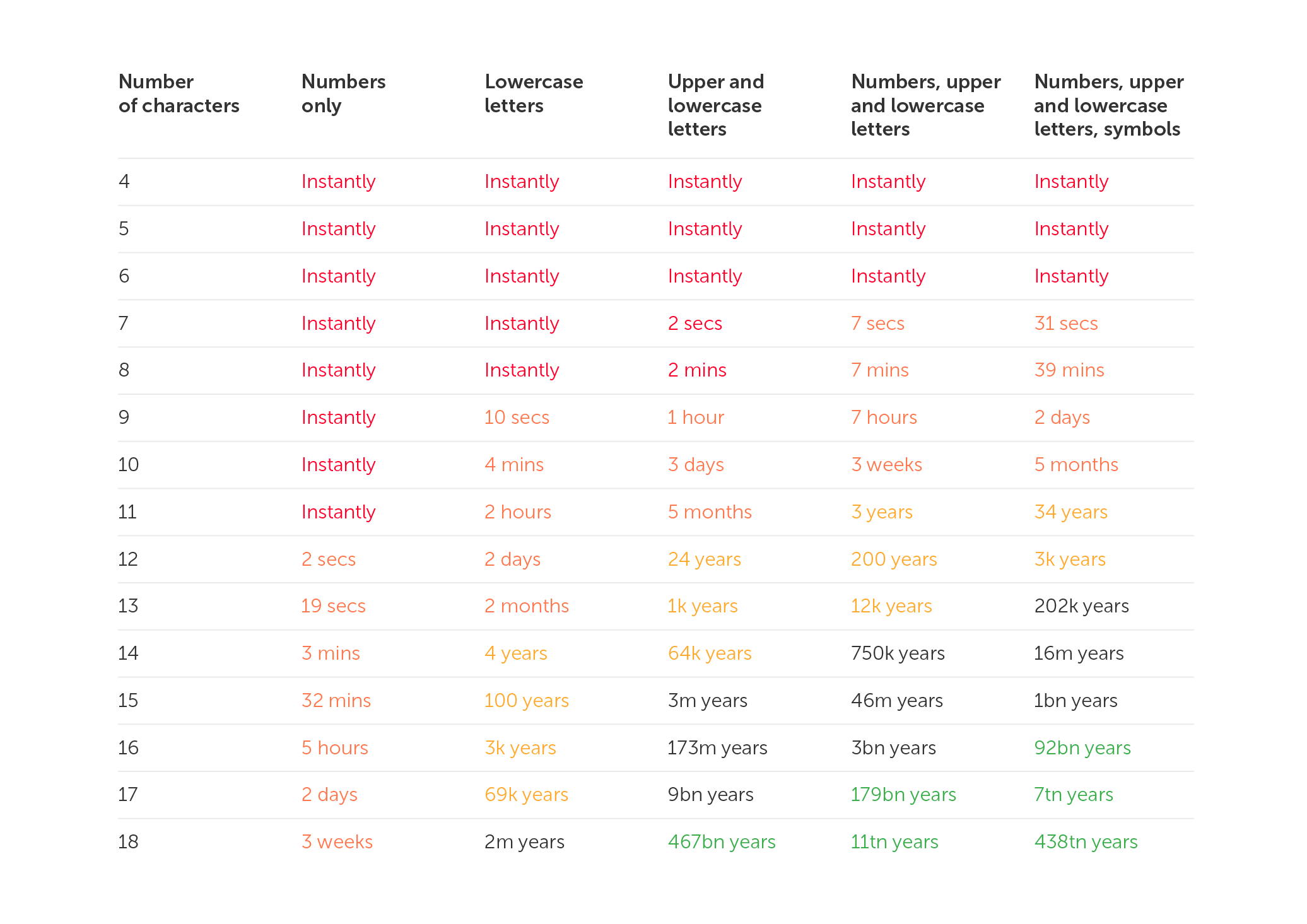 - Aim for 16-20 characters minimum